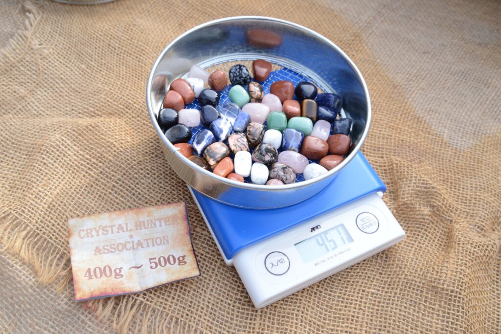指定された重量に合うようにパワーストーンをザルに乗せます。