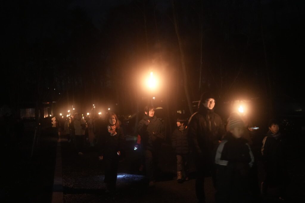 みんなでキャンプ場内をたいまつを持って行進します。とても幻想的な景色になりますよ♪