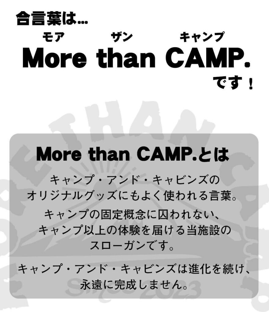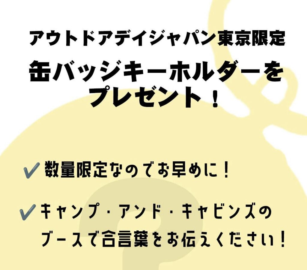 キャンプアンドキャビンズのブースで合言葉「More than CANP.(モアザンキャンプ)」とお伝えください!