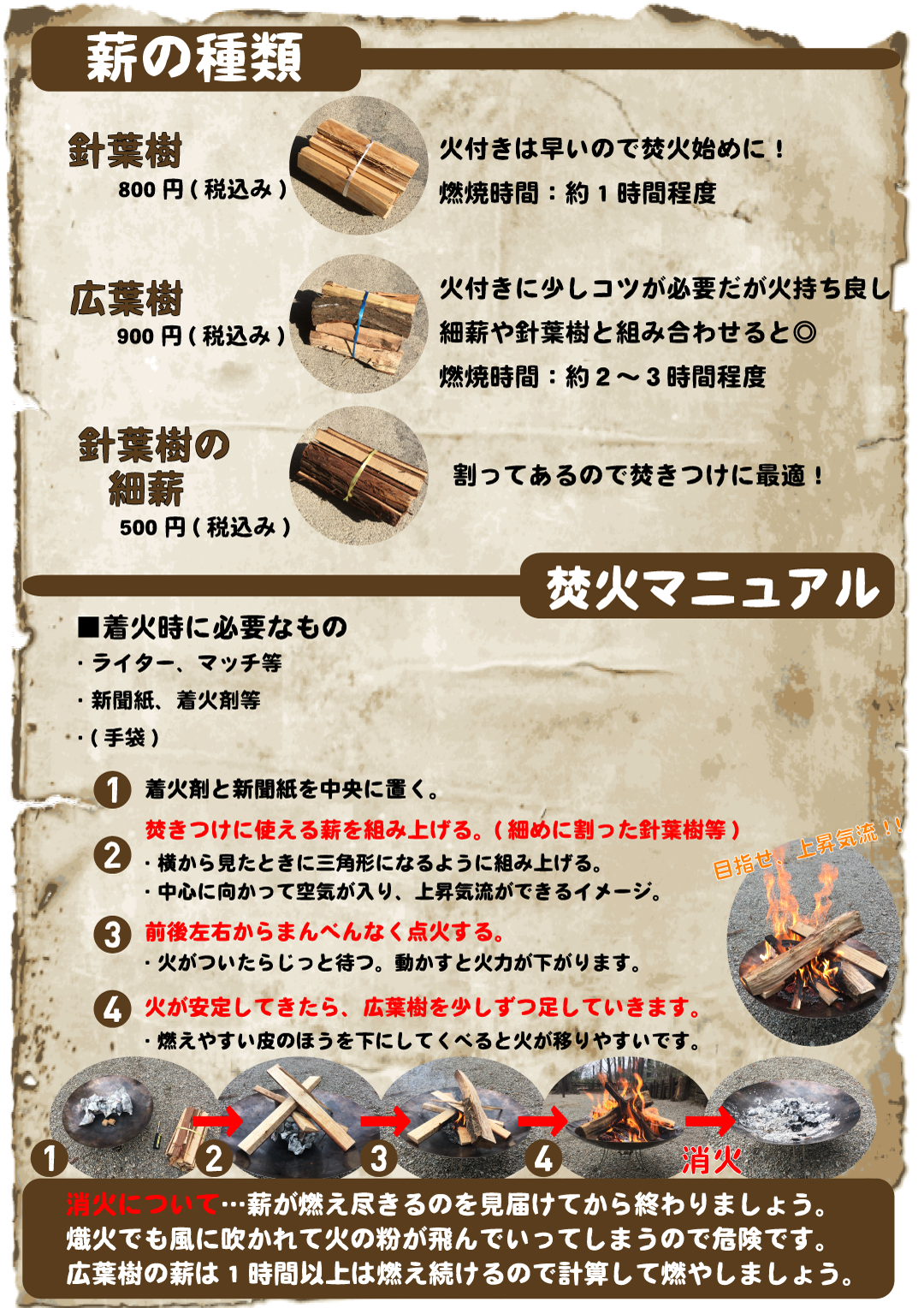 ・焚き付け用の細薪(針葉樹):500円 ・太薪(針葉樹):800円 ・太薪(広葉樹)900円